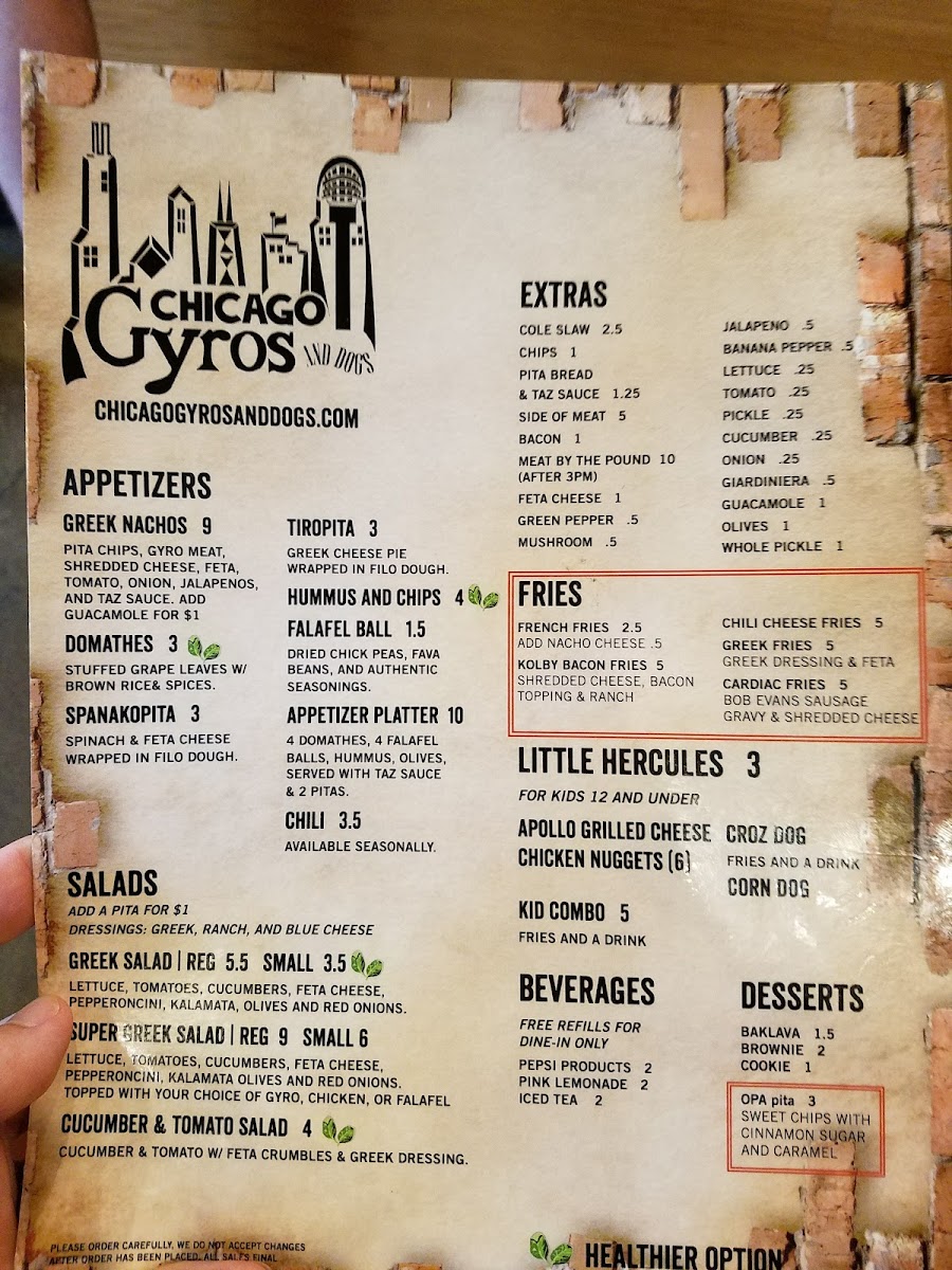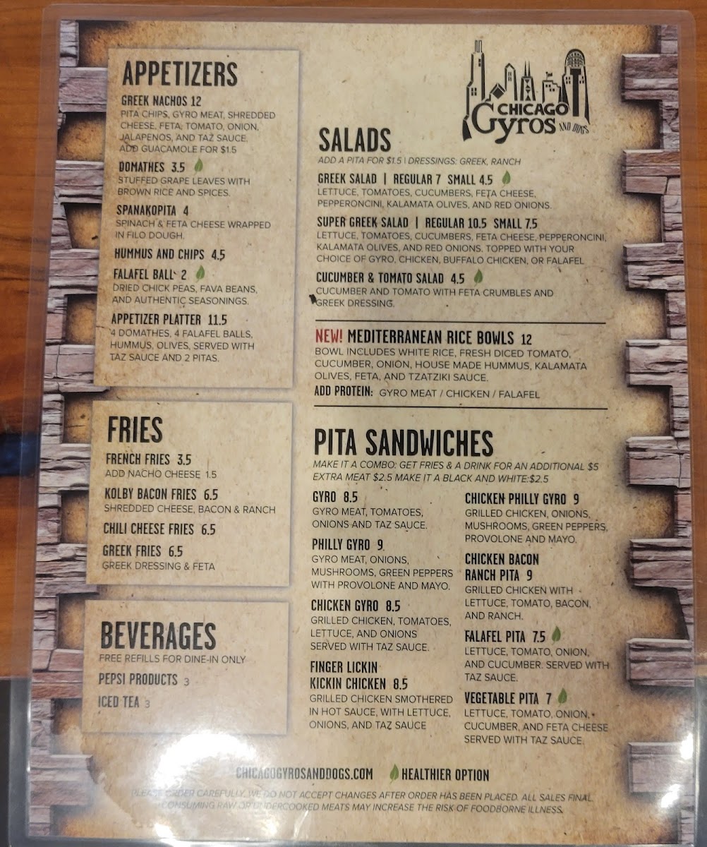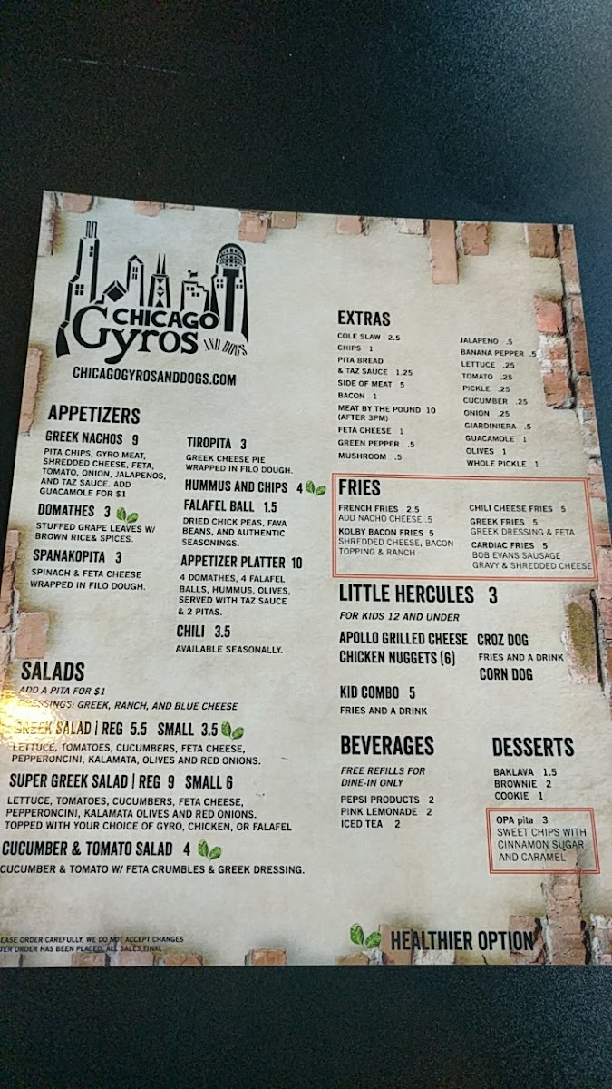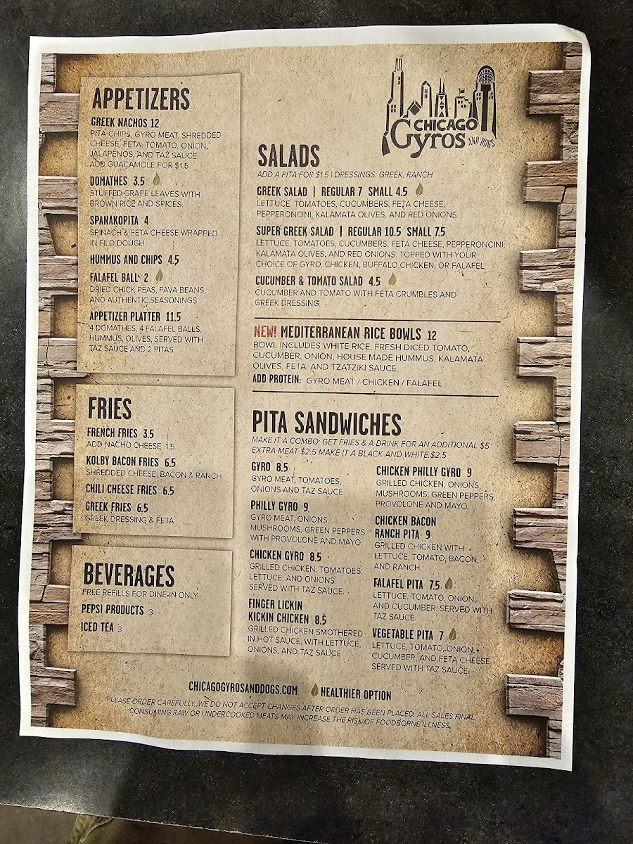 Chicago Gyros and Dogs boasts an enticing menu that features a variety of delectable dishes. Start your meal with their Tiropita, a flaky Greek cheese pie wrapped in delicate filo dough, or indulge in the Appetizer Platter which combines falafel, hummus, olives, and stuffed grape leaves, all served with warm pitas and tzatziki sauce for a full flavor experience at just $12.50.